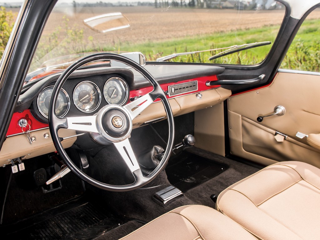 Les différences par rapport à la deuxième série de la Giulietta Sprint ne sont pas très nombreuses. De simples monogrammes 1600 placés sur le coffre arrière et les ailes avant différencient visuellement la Giulia de la Giulietta ainsi que les clignotants latéraux devenus rectangulaires. Par contre, l’intérieur profite d’une planche de bord redessinée, revêtue de similicuir avec des nouvelles commandes de chauffage. Le volant en bakélite noir possède 3 branches en alu. Les panneaux de portières sont entièrement recouverts de similicuir. A partir de juillet 1963, les cadrans sont placés sur un fond noir. La Giulia Sprint 1600 sera construite à 7 107 exemplaires dont les dernières en 1964.