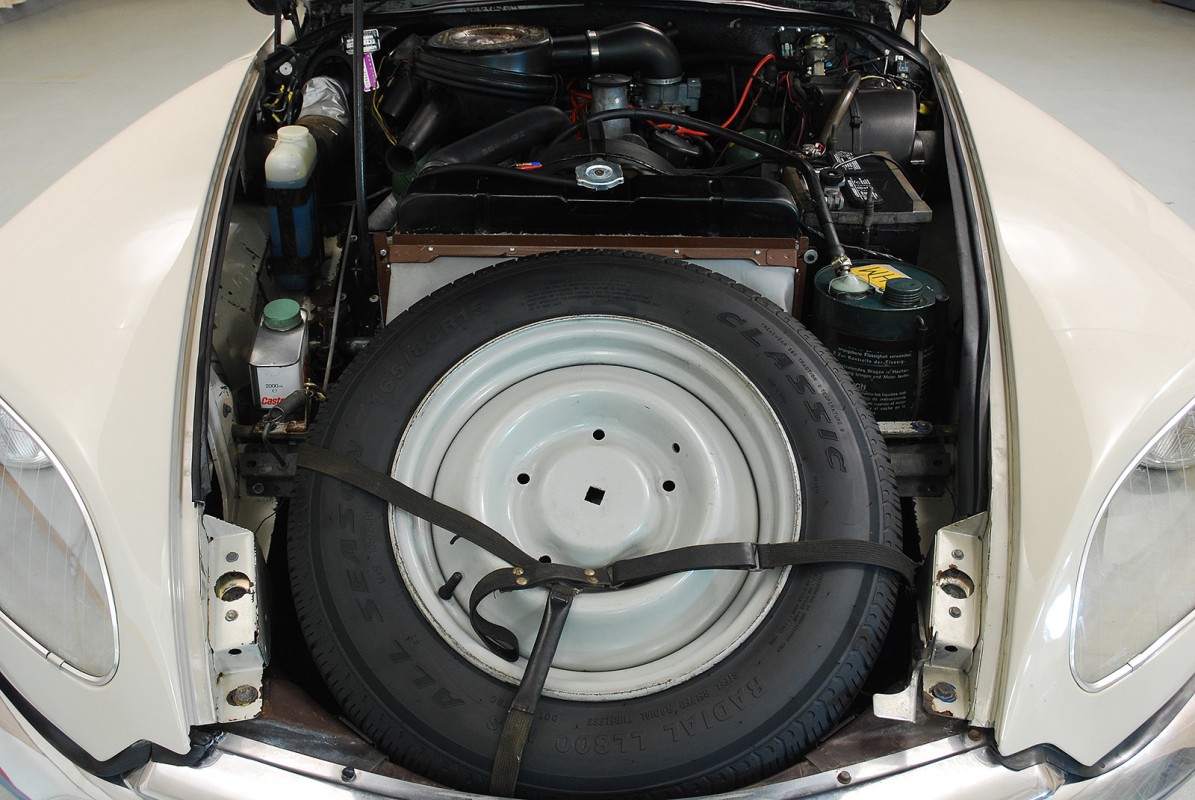 La planche de bord est également agrémentée d’un cendrier, d’une montre électrique sur la console centrale et d’une boîte à gants fermant à clé. Les poignées de portes et les manivelles de montée de glaces sont chromées comme sur les DS