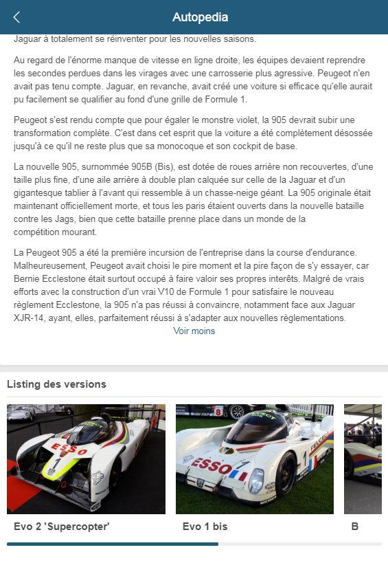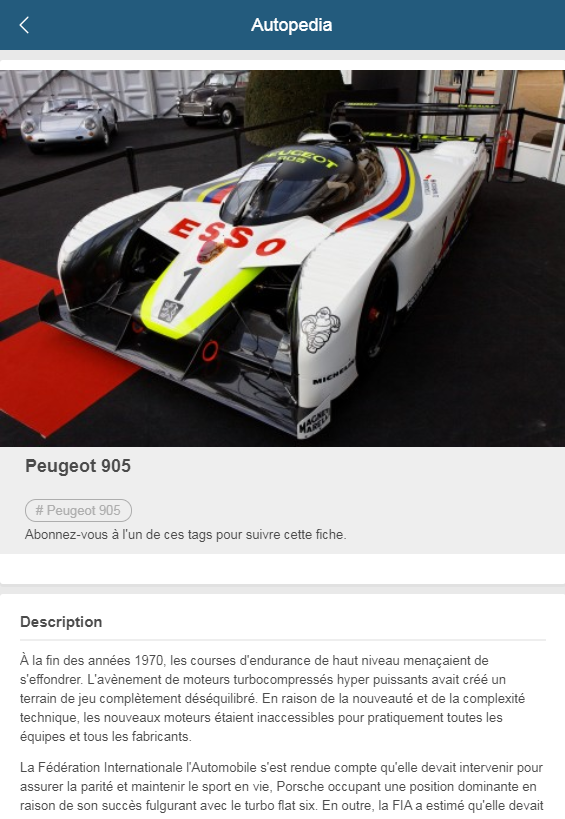 Plus de 1000 fiches sont disponibles et la Peugeot 905 en fait partie. Pour voir la fiche cliquez ici.